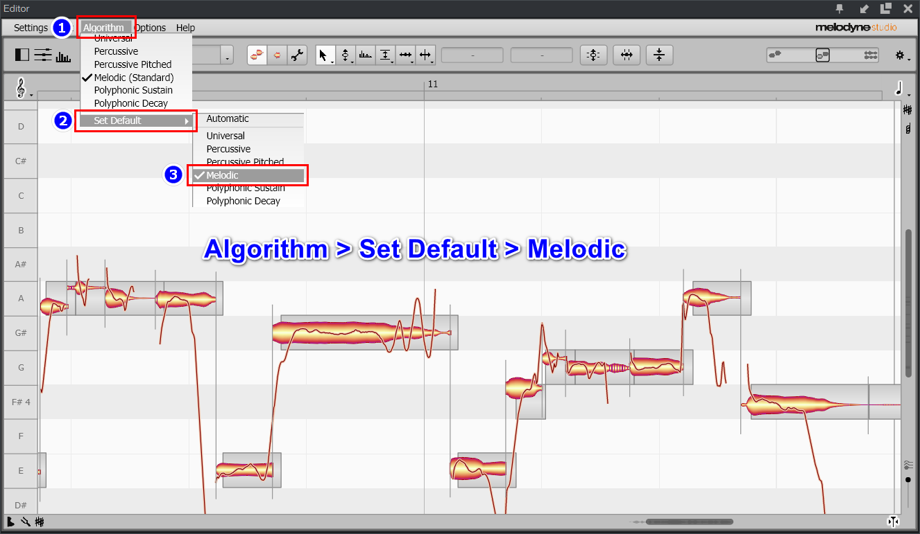 * 단선율인데도 일부 노트가 화음으로 표시될 때도 Algorithm > Melodic 메뉴를 클릭해 준다. Change Algorithm 대화상자가 나타나면 Redetect 버튼을 클릭해 준다.