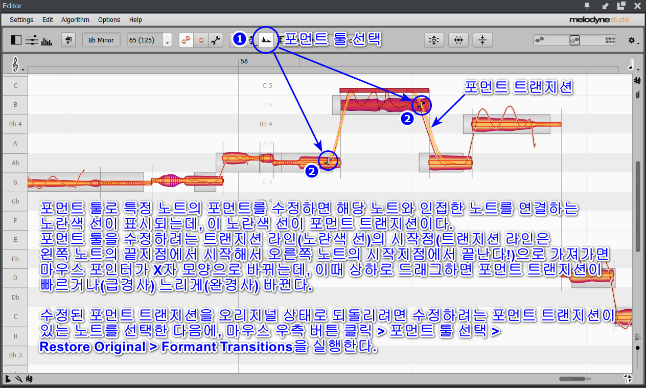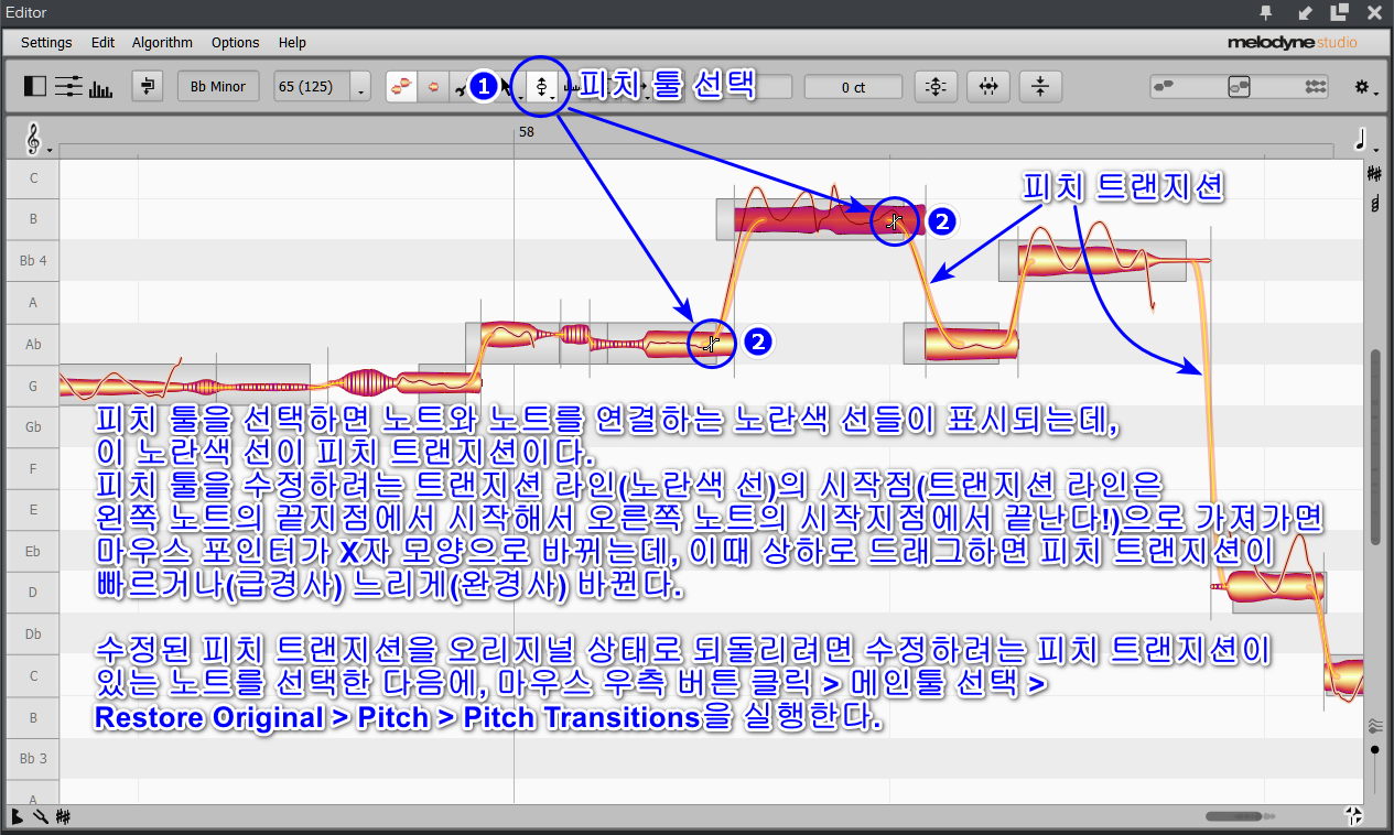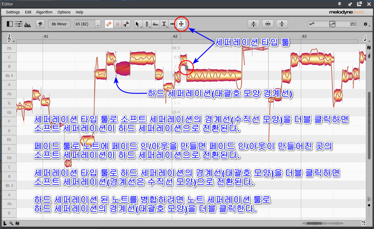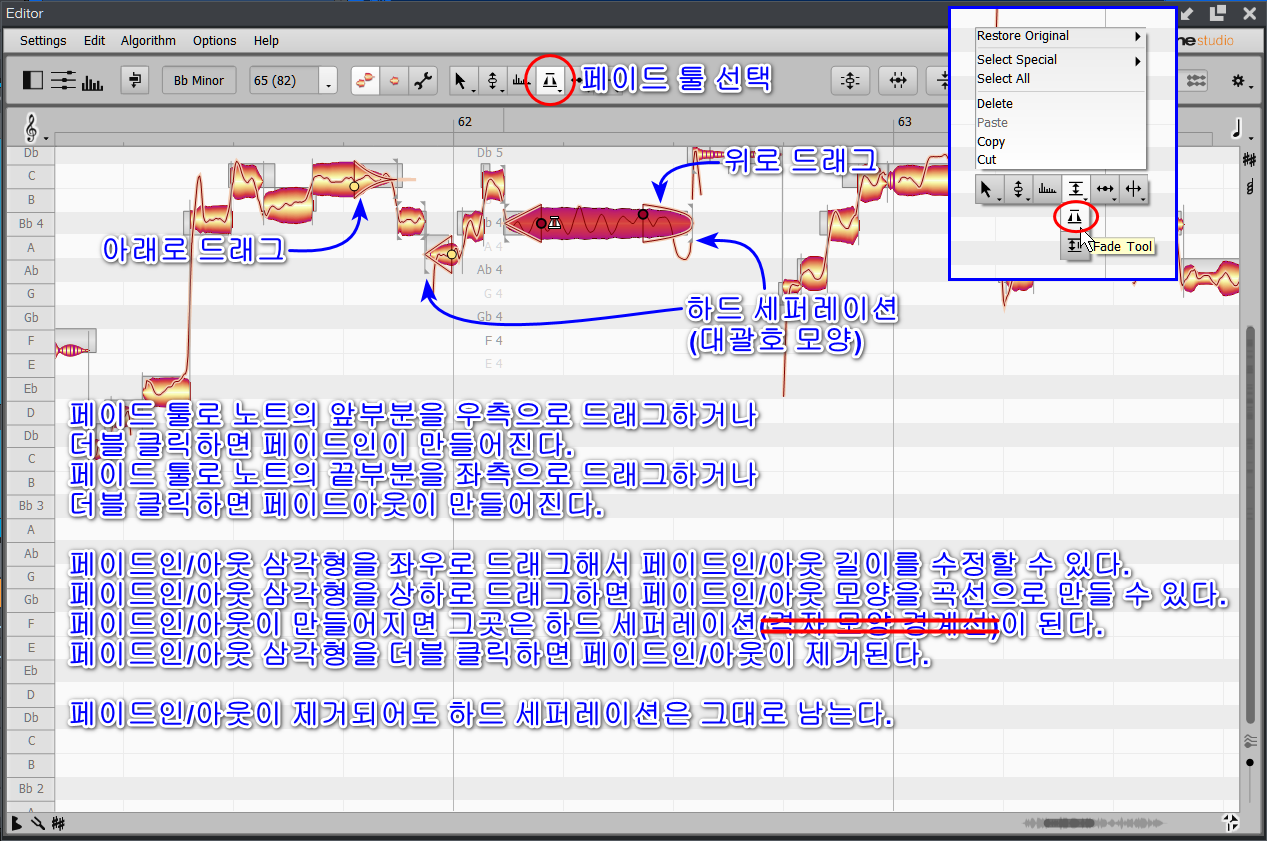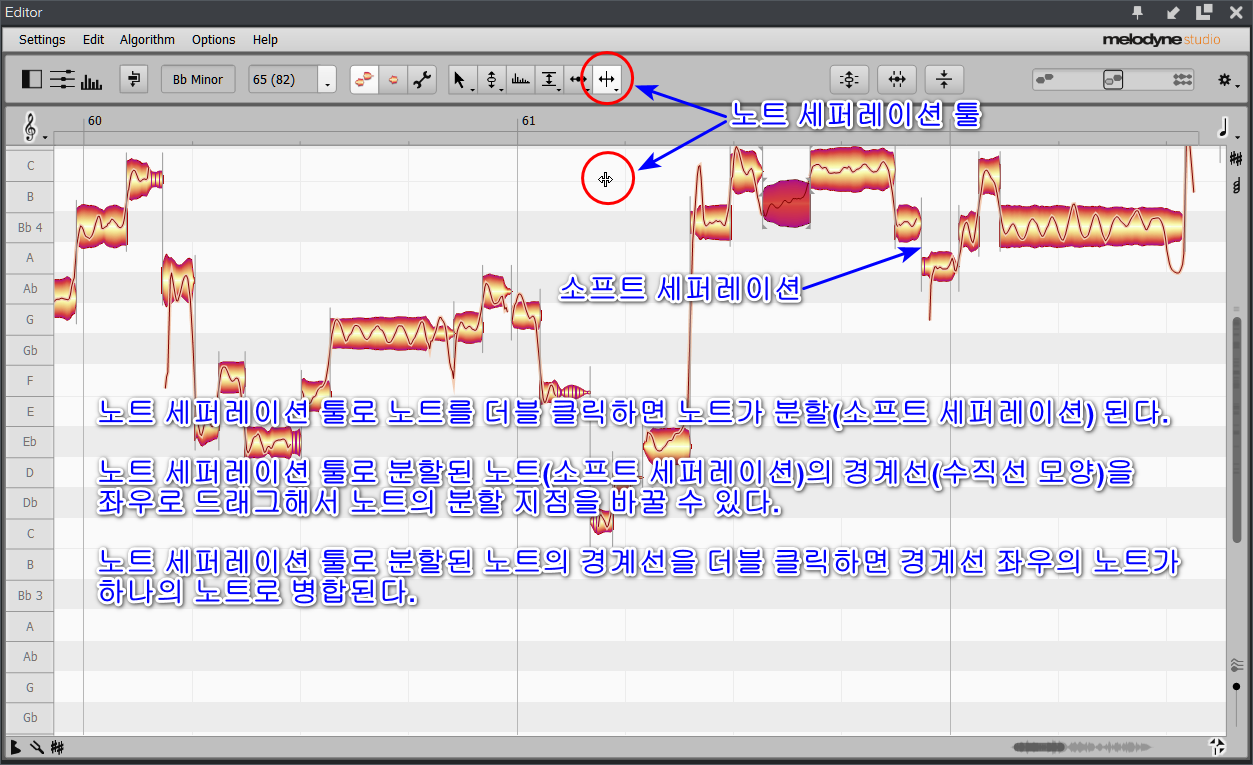 * 코렉트 피치 매크로를 사용한 후에 특정 노트를 분할해야 한다면