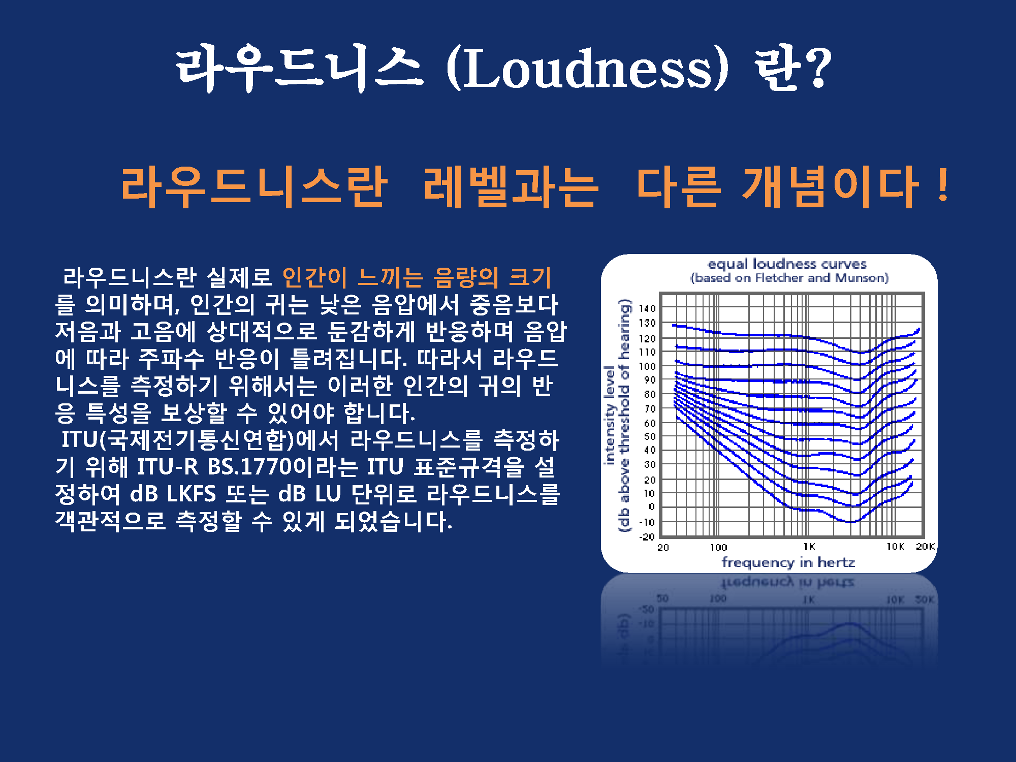 1) 라우드니스(Loudness): 인간이 실제로 체감하는 객관적인 음량의 크기(청감음량)