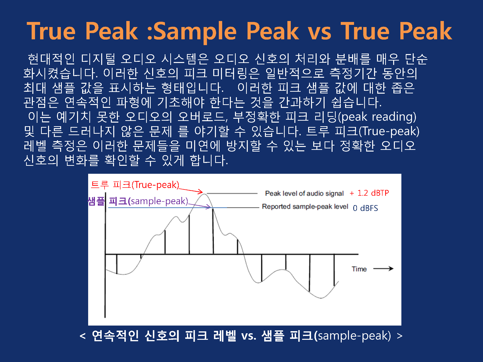 2) 트루 피크(dBTP, ISP): 연속적인 소리 샘플들을 이어 붙여서 아날로그 파형으로 환산했을 때의