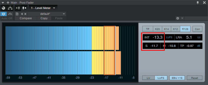 스튜디오 원 내장 Level Meter로도 라우드니스 값을 확인할 수 있습니다.