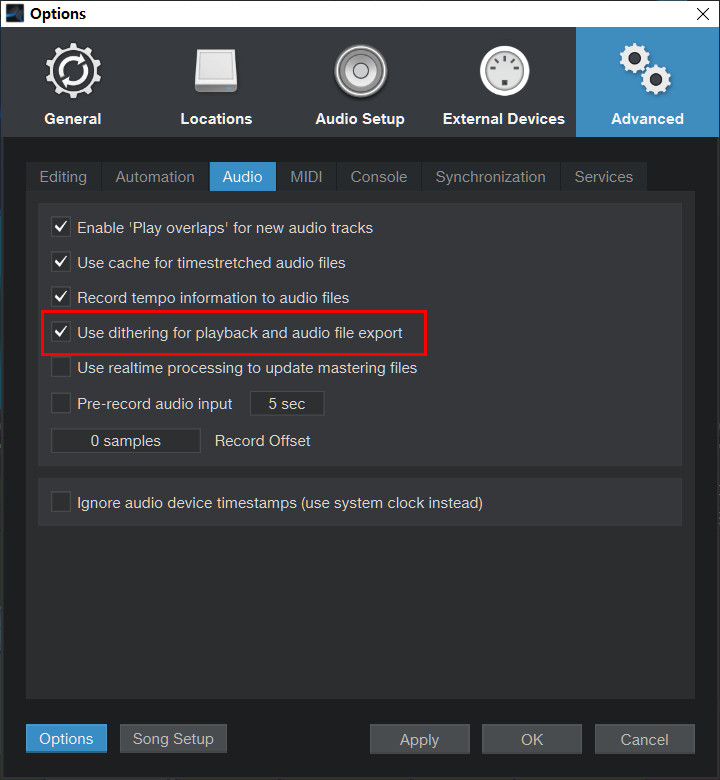 Use dithering for playback and audio file export가 바로 그것인데 기본값으로 체크되어 있습니다.