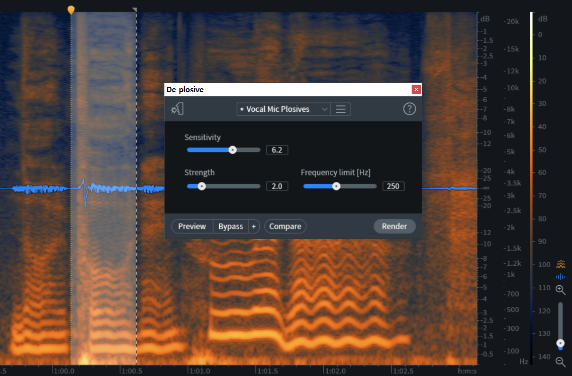 de-plosive 모듈에서 프리셋 Vocal Mic Plosives를 선택한 다음