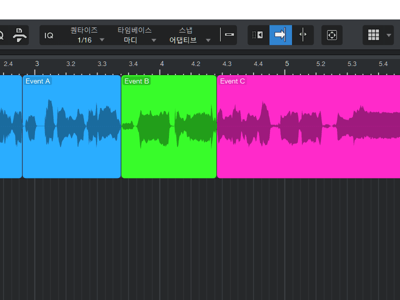 클립 게인 엔벨로프는 시그널 플로우 상 트랙/채널의 볼륨 페이더나 인서트단보다 앞선 이벤트 클립 레벨에서 볼륨을 오토메이션할 수 있는 기능입니다. 각각의 이벤트별로 이 기능을 키거나 끌 수 있으며, 이 기능을 활성화한 경우 이벤트 위에 바로 볼륨 오토메이션을 그릴 수 있습니다. 볼륨 오토메이션 커브에 따라 웨이브폼의 모양이 바로 커지거나 줄어들기 때문에 직관적으로 다이나믹을 제어할 수 있습니다.